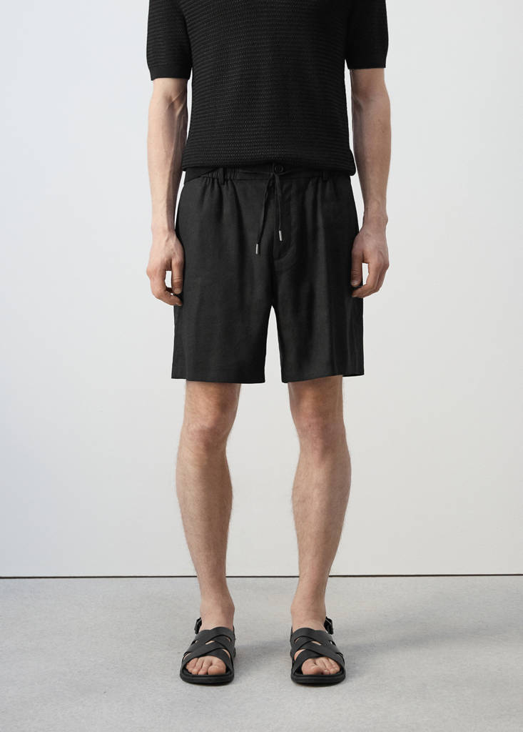 Linen mix. Regular waist. Slim fit. Belt loops. Two side pockets. Two welt pockets at the back. Button and zip fastening. Inner lining