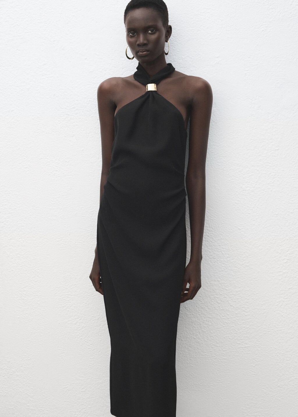 Midi design. Straight Design. Halter neck. Metallic detail. Side pleats. Zip fastening on the back section. Inner lining. Online Exclusive.