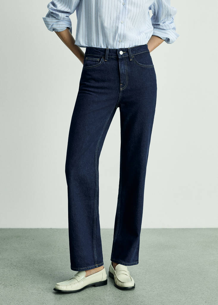 Recycled cotton-blend fabric. Denim-style cotton fabric. Straight design. Long design. Rinse wash. Mid-rise. Two side pockets. Two patch pockets at the back. Belt loops. Zip and button fastening. Inseam 78 cm. Full length. Available Plus