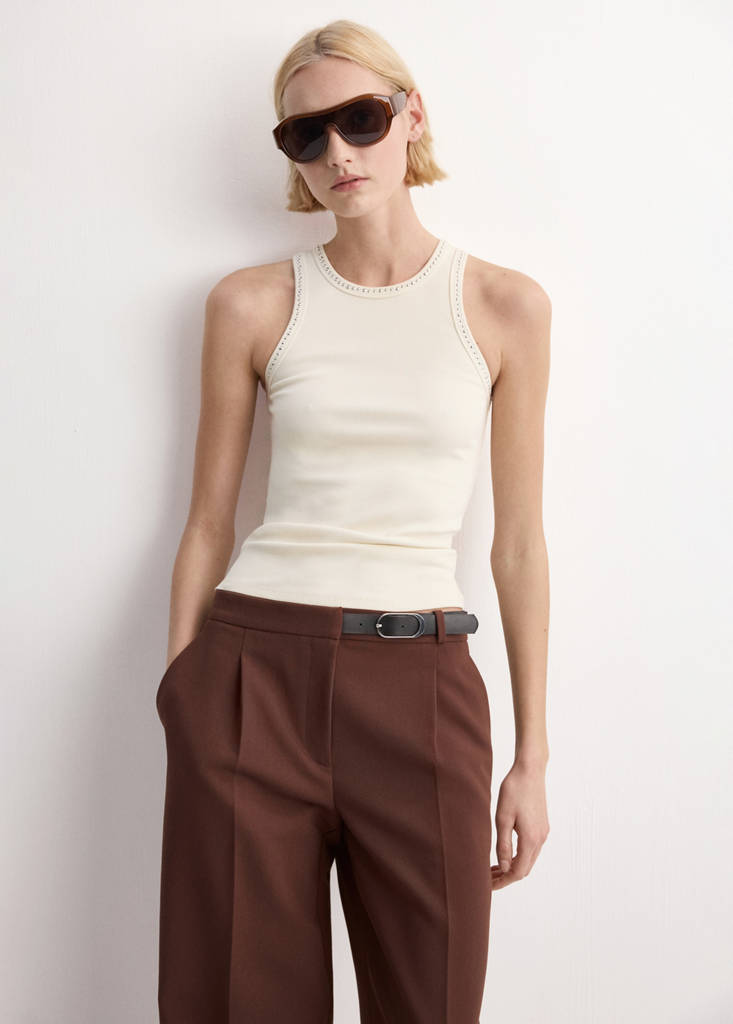 Diseño entallado. Ribetes en contraste. Detalle de tachuelas. Cuello redondo. Sin mangas. Sin cierre
