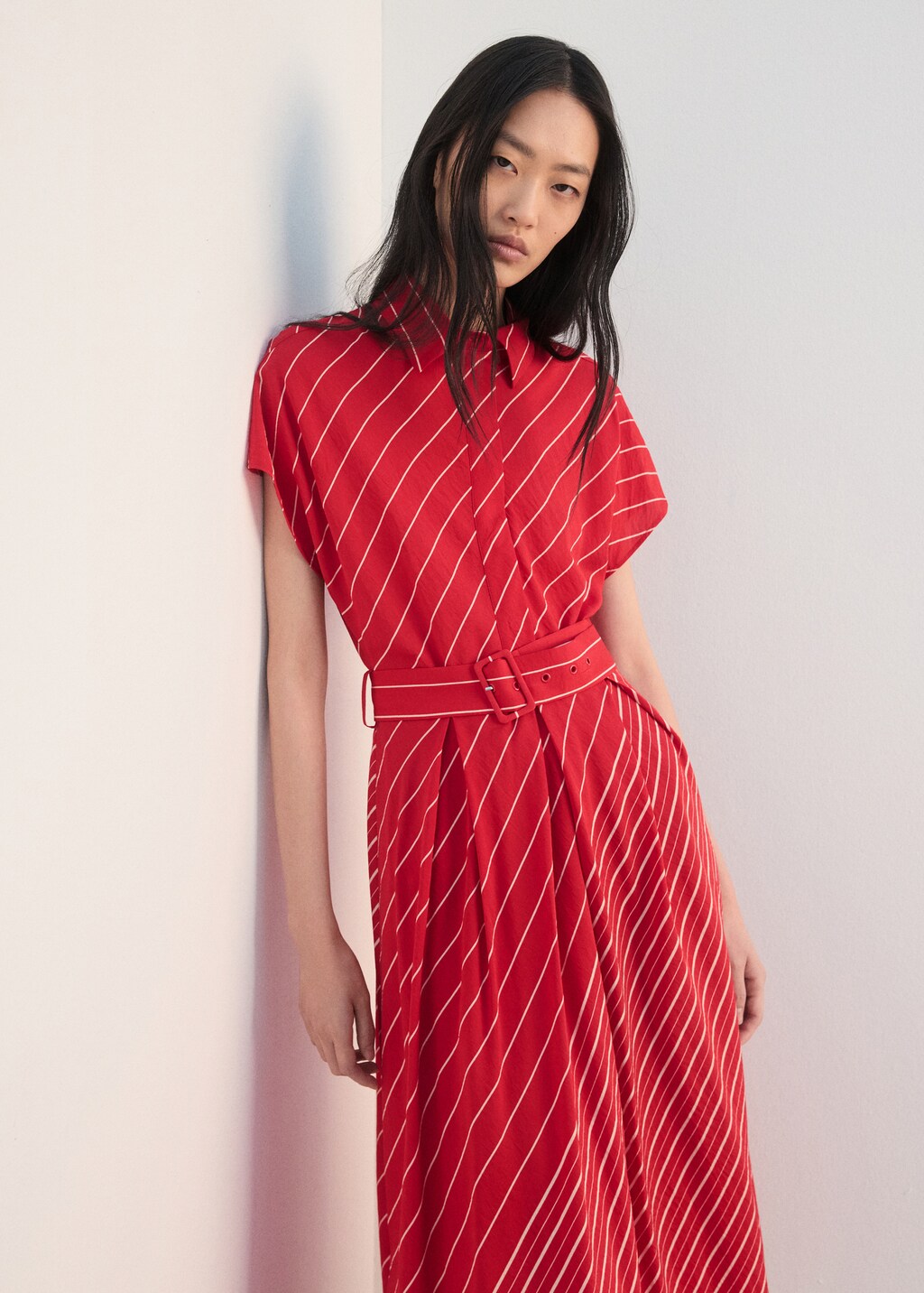 Diseño largo. Diseño recto. Estampado Rayas. Cuello camisero. Manga corta. Cinturón con cierre de hebilla. Cierre delantero con botones.