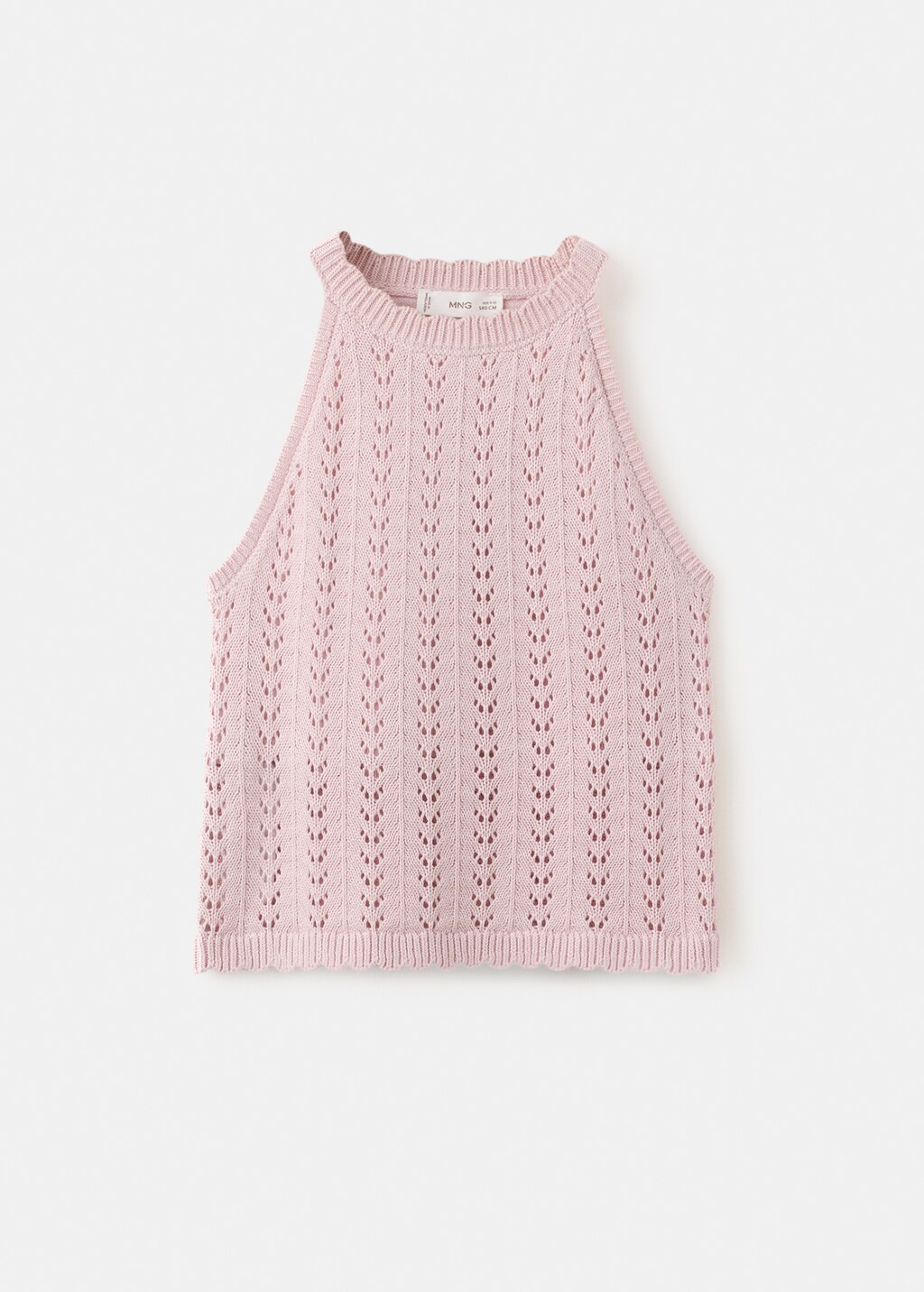 Tejido 100% algodón. Tejido de punto calado. Cuello redondo. Sin mangas. Detalles festoneados.