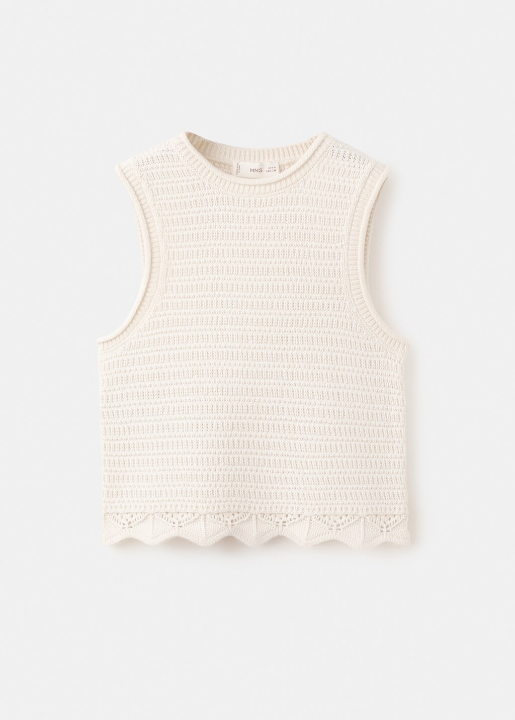 Tejido 100% algodón. Tejido de punto. Cuello redondo. Tirantes. Sin mangas. Detalles festoneados.