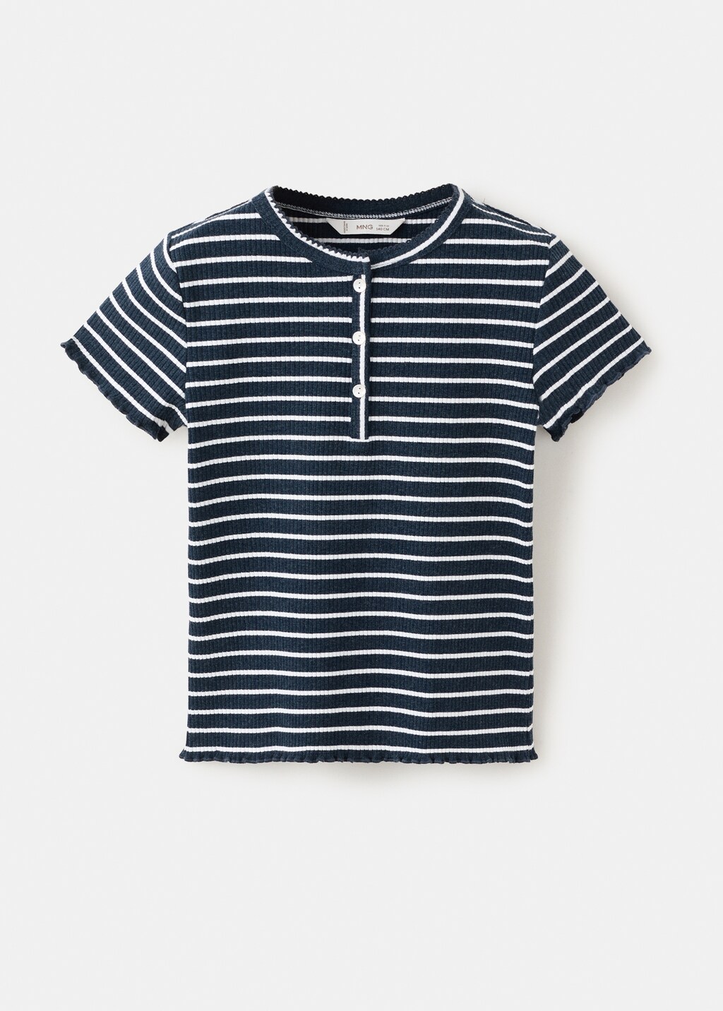 Tejido de algodón. Tejido de punto fino. Tejido de rayas. Cuello redondo de punto canalé. Manga corta con detalles pespunteados. Cierre de botones en la parte delantera.
