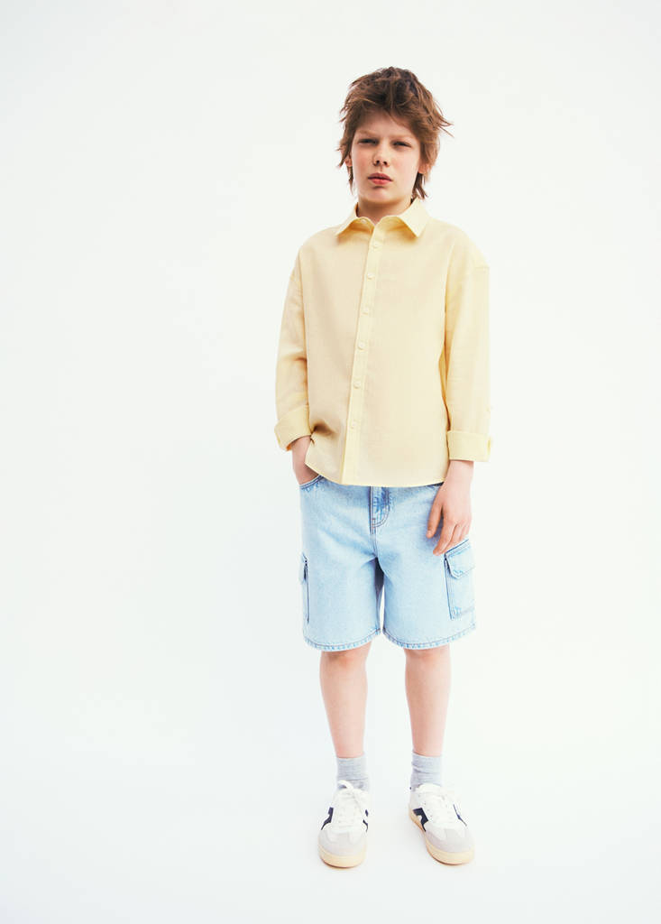 Tejido mezcla de lino y algodón. Diseño recto. Cuello camisero. Manga larga con puños abotonados. Cierre delantero con botones