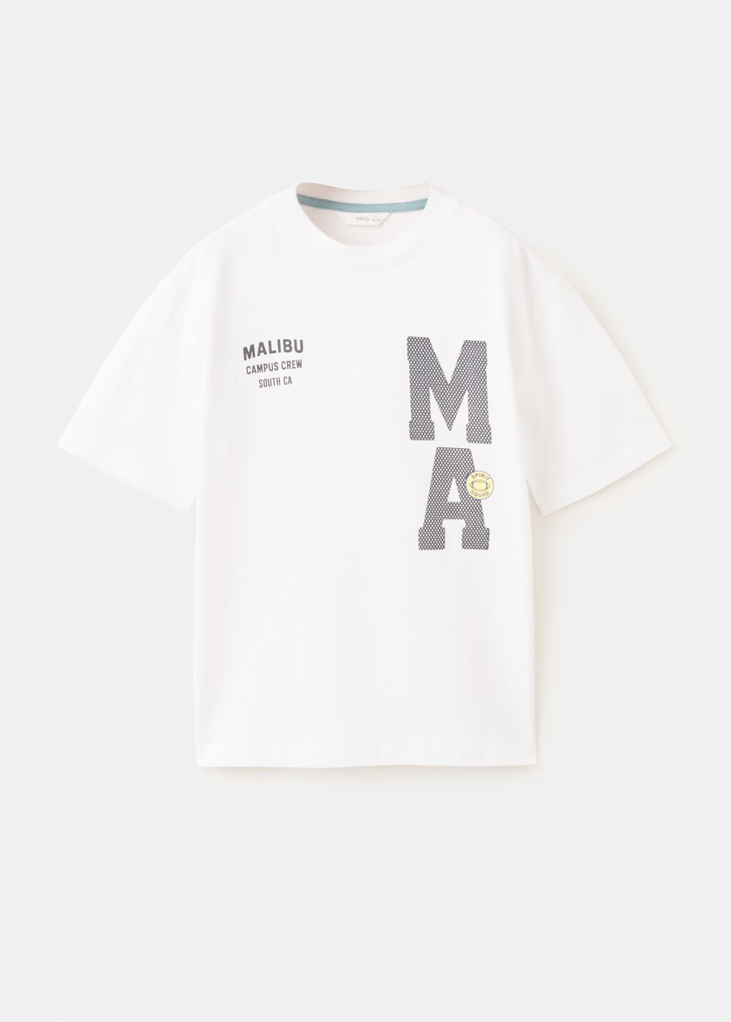 Tejido 100% algodón. Diseño recto. Cuello redondo. Manga corta. Texto estampado en la parte frontal.