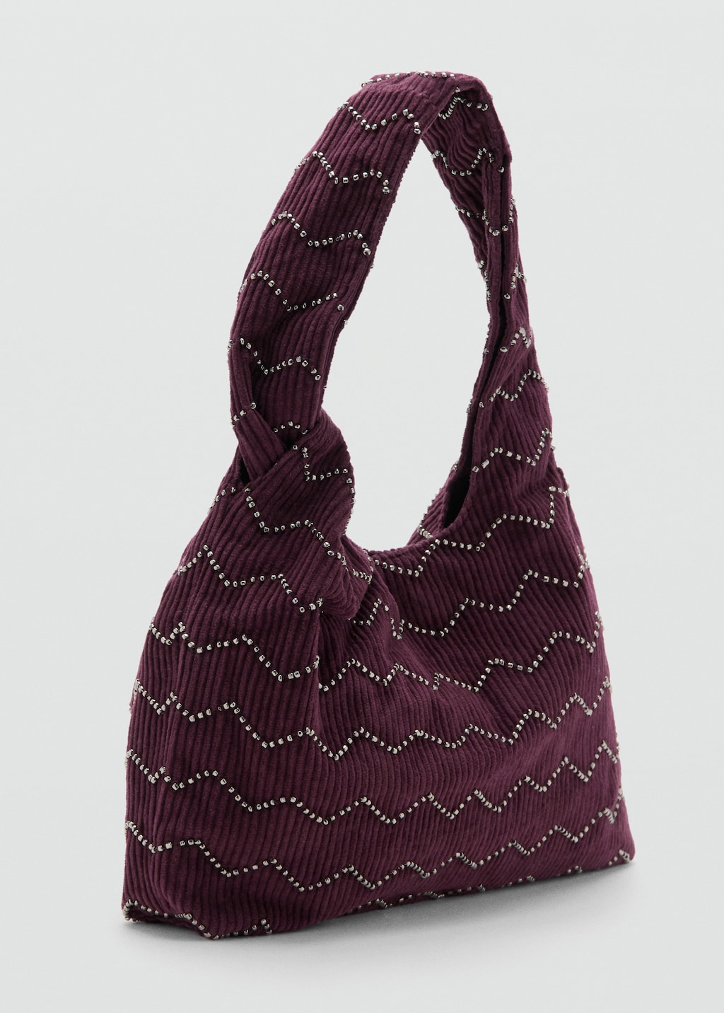 Tejido de pana. Panel abalorios. Detalle nudo. Cierre de botón metálico. Asa corta.