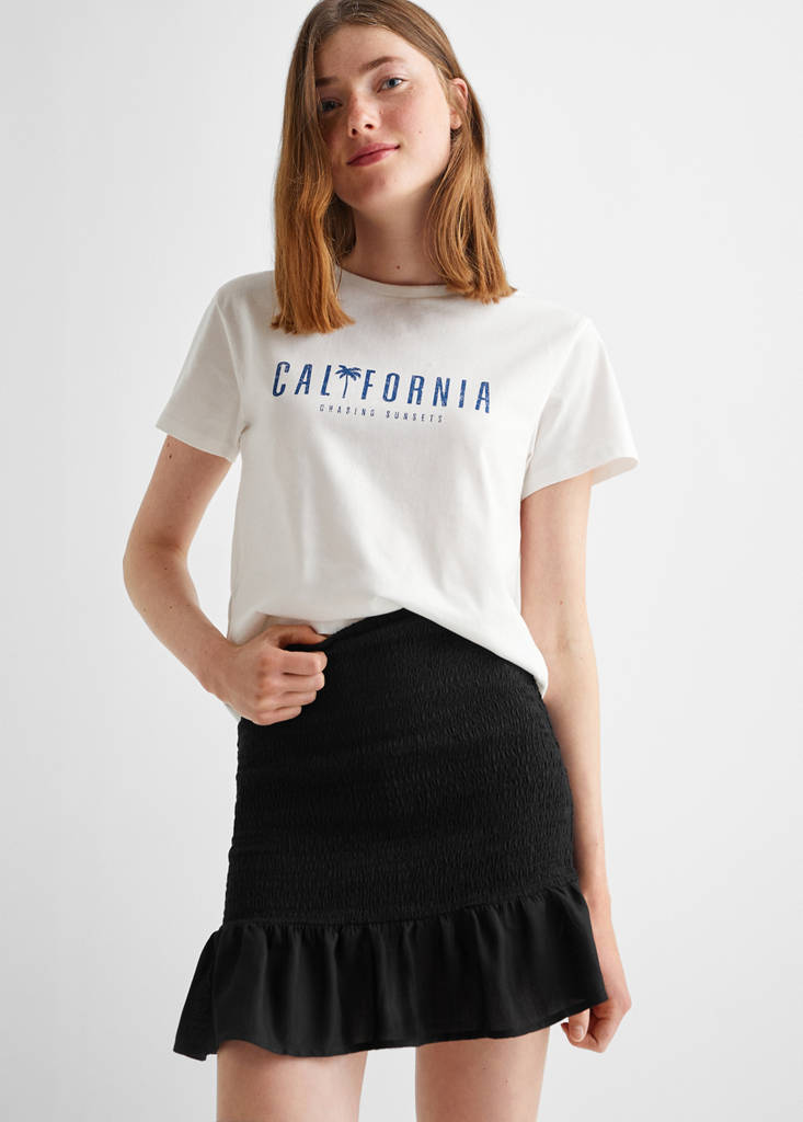 Falda fruncida volantePrecio actual [US$ 39.99 ]US$ 39.99Selecciona un colorNegroSelecciona tu tallaXXSNo disponible ¡Lo quiero!XSNo disponible ¡Lo quiero!SNo disponible ¡Lo quiero!MNo disponible ¡Lo quiero!LNo disponible ¡Lo quiero!MedidasAvísameAñadir a FavoritosVer lookEnvío gratis a tiendaTejido de viscosa. Tejido fruncido. Diseño corto. Fruncido elástico. Corte slim. Volante en el bajo. La modelo mide 172 cm y lleva una talla MDetalles, composición y cuidadosDisponibilidad en tienda