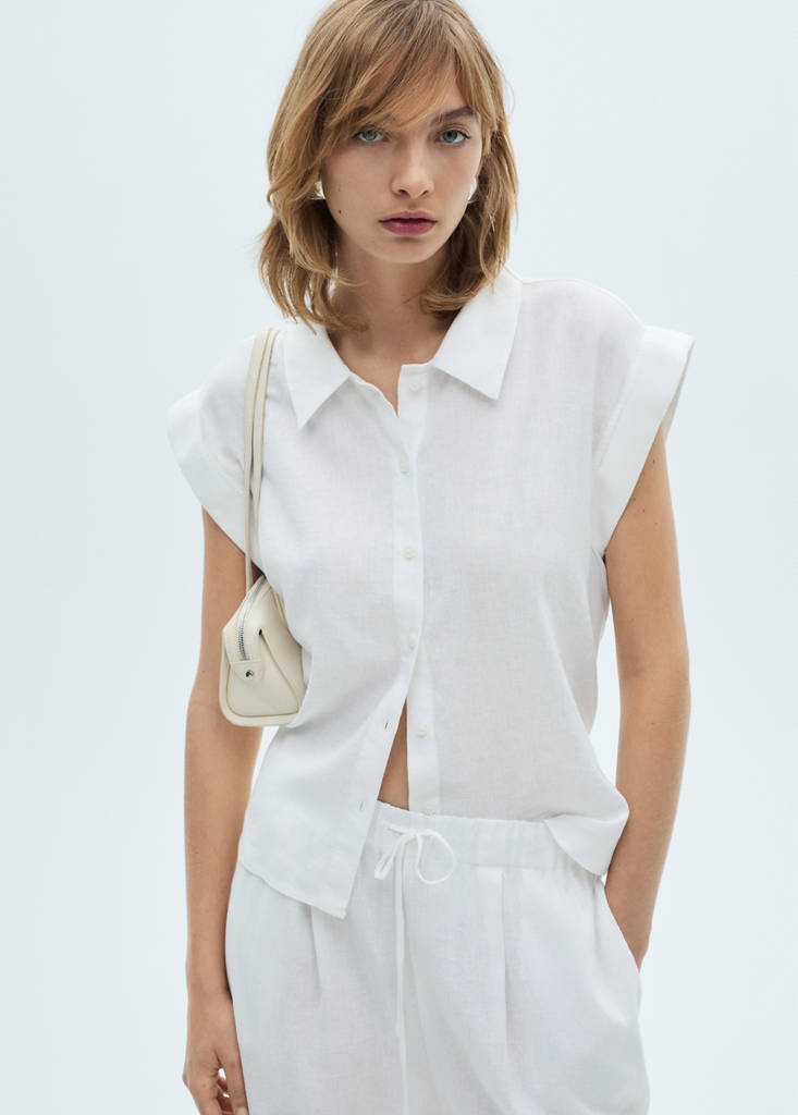 Tejido mezcla de lino. Diseño estándar. Diseño recto. Cuello camisero. Manga corta. Cierre de botones en la parte delantera