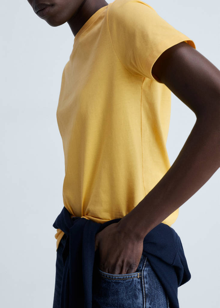 Tejido de algodón. 80% algodón orgánico y 20% algodón reciclado. Tejido de gramaje ligero (160gm/m2). Regular fit. Diseño recto. Cuello redondo. Manga corta. Sin cierre