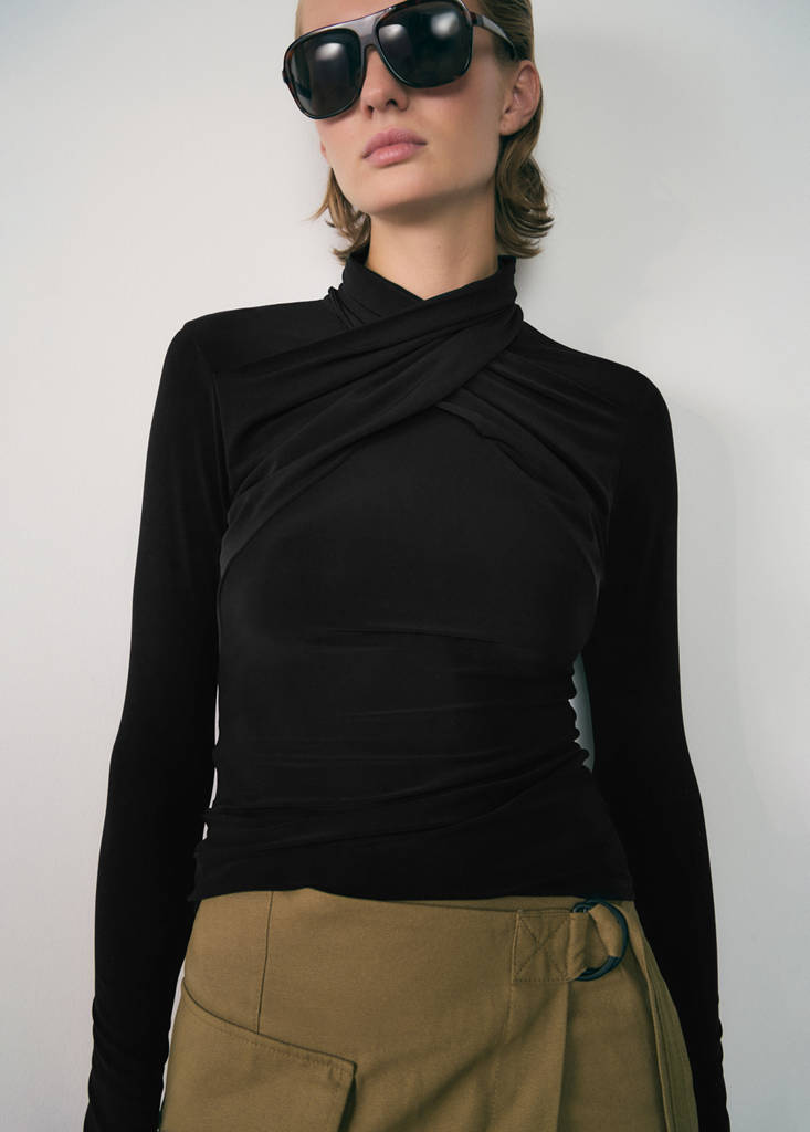 Tejido fluido. Diseño entallado. Cuello alto. Cuello cruzado. Manga larga. Sin cierre
