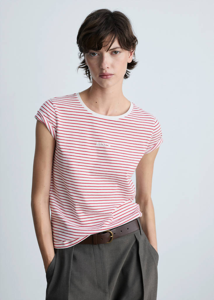 Tejido de algodón reciclado. Detalle de logo. Manga corta. Diseño recto. Estampado de rayas. Cuello redondo. Camiseta de manga corta. Logo estampado. 100% algodón. Tejido de algodón. Tejido de punto fino. Sin cierre. Disponible en liso o estampado. Diseño de rayas. Tejido 100% algodón