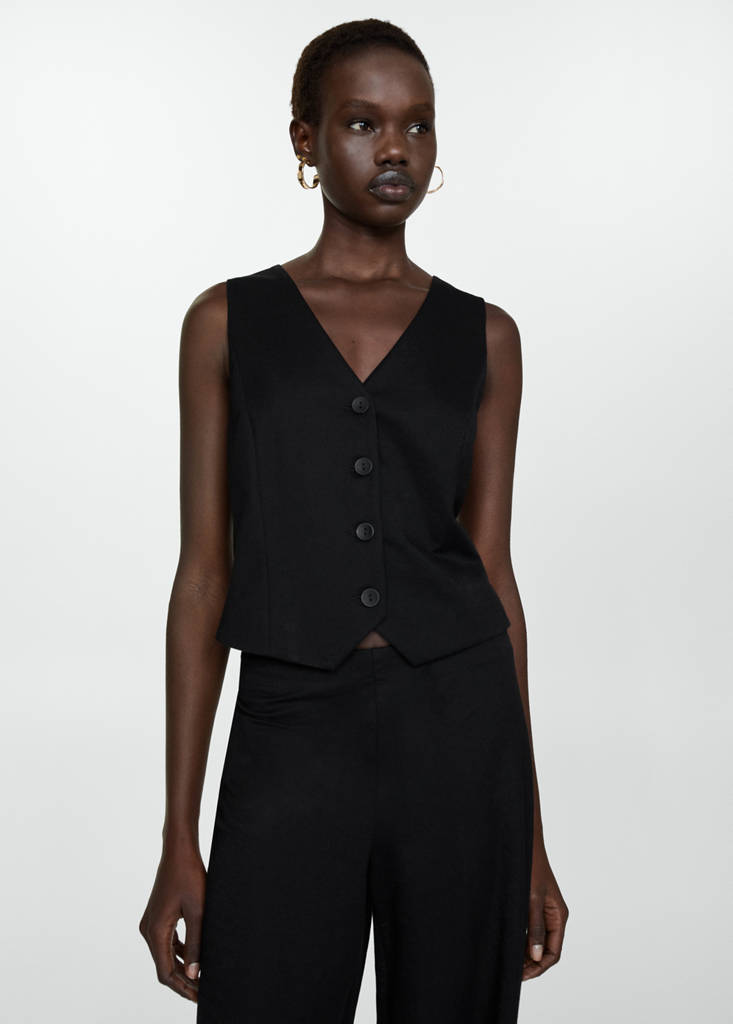 Chaleco botonesPrecio actual [S/. 129.90 ]S/. 129.90Selecciona un colorNegroLa modelo lleva la talla S y mide 177cm.Selecciona tu tallaXXSXSSMLXLXXLAñadir a FavoritosVer lookEnvío gratis a tiendaTejido fluido. Diseño crop. Diseño recto. Escote de pico. Sin mangas. Abertura posterior en el bajo. Cierre delantero con botonesDetalles, composición y cuidadosDisponibilidad en tienda
