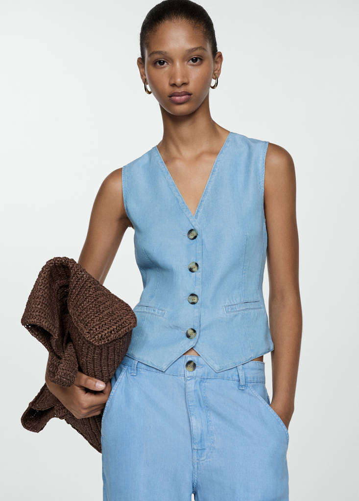 100% lyocell. Tejido fluido. Diseño recto. Cuello pico. Sin mangas. Dos bolsillos de ribete delanteros. Cierre de botones en la parte delantera. Costuras decorativas. Total look