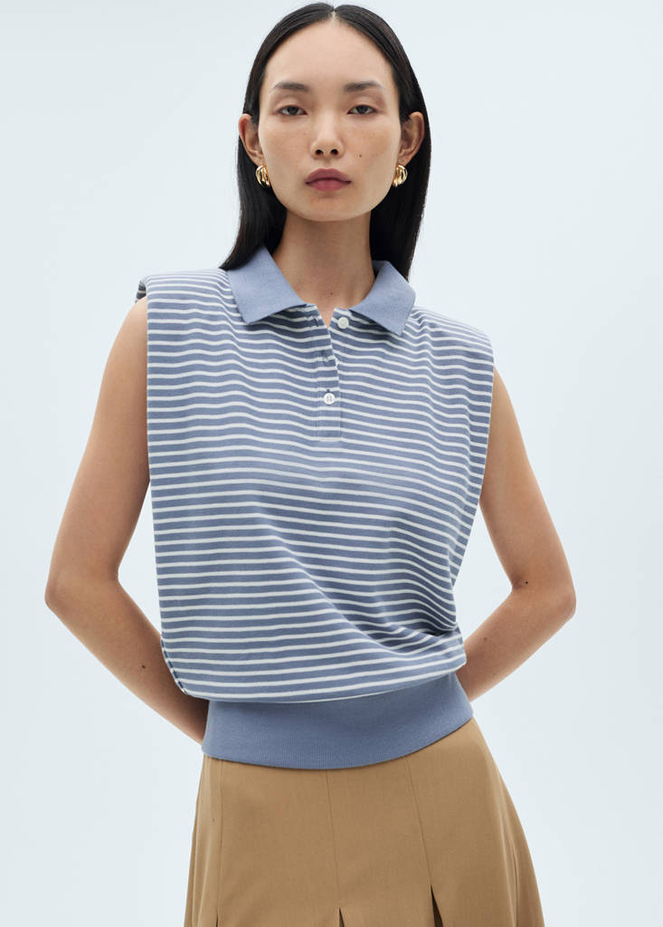 Tamaño mediano. 100% Algodón. Diseño estándar. Diseño recto. Estampado de rayas. Cuello polo. Sin mangas. Cierre de botones en el cuello. Cierre en el cuello