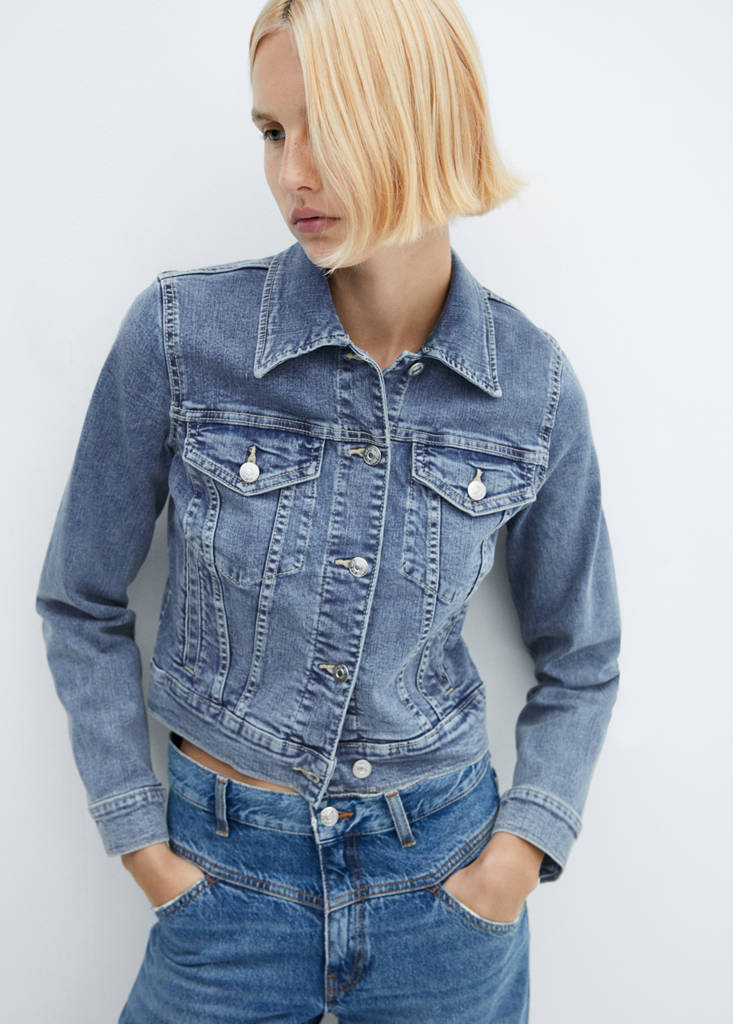 Tejido de algodón estilo tejano vaquero. Diseño corto. Manga larga. Cuello de solapa. Manga larga con puños abotonados. Dos bolsillos de solapa con botón en la parte delantera. Cierre de botones en la parte delantera. Disponible Plus