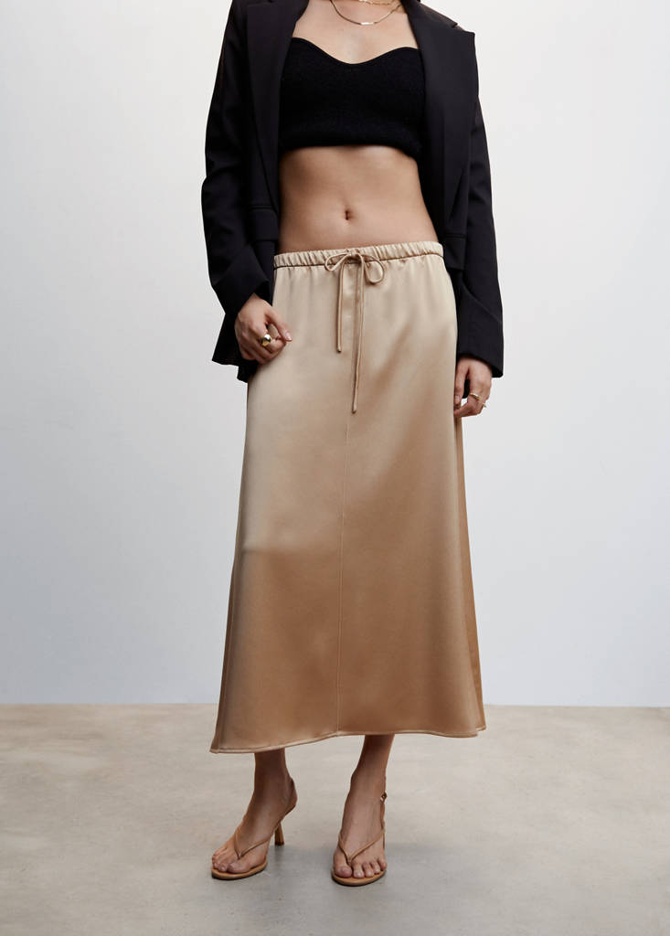 Tejido satinado. Diseño recto. Diseño midi. Cintura con goma elástica. Cierre de lazo. Festival Season