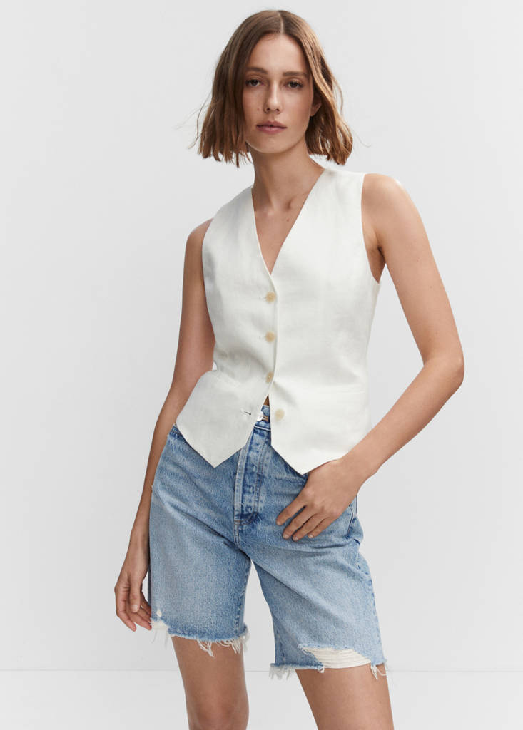 Tejido de algodón estilo tejano vaquero. Tamaño mediano. Diseño recto. Tiro alto. Trabillas. Cinco bolsillos. Cierre de botones. Detalle rotos decorativos. Disponible Plus. Festival Season