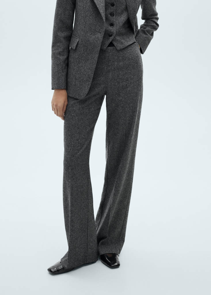 Tejido mezcla de lana. Tejido jaspeado. Estilo traje. Diseño largo. Diseño recto. Tiro bajo. Cierre cremallera invisible en el lateral. Total look