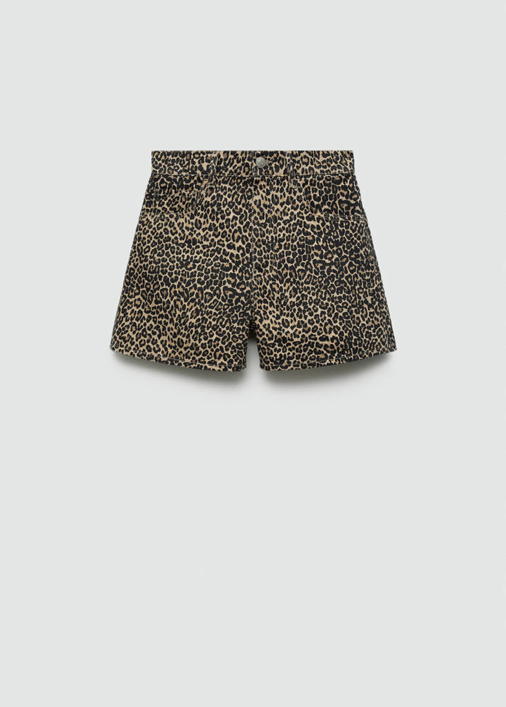 Tejido de algodón estilo tejano vaquero. Diseño corto. Diseño recto. Tiro alto. Estampado de leopardo. Dos bolsillos de parche en la parte delantera. Bolsillo portamonedas. Dos bolsillos de parche en la parte posterior. Trabillas. Cierre delantero de cremallera y botón