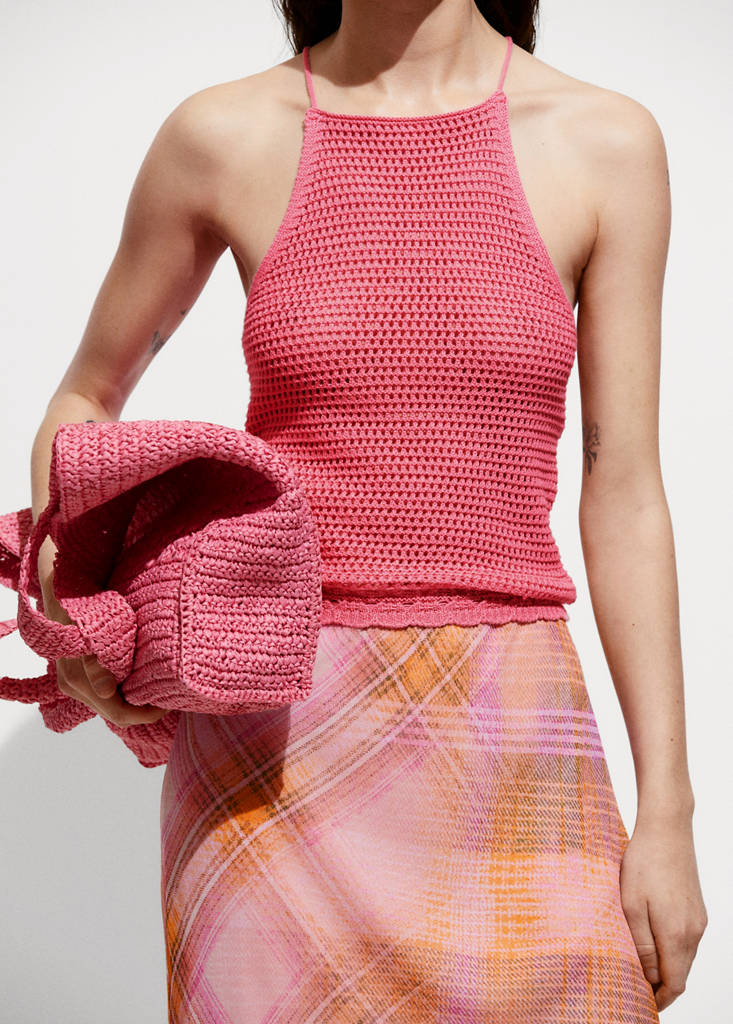 Top punto crochetPrecio actual [S/. 129.90 ]S/. 129.90Selecciona un colorFucsiaLa modelo lleva la talla S y mide 178cm.Selecciona tu tallaXXSXSSMLXLXXLMedidasAñadir a FavoritosVer lookEnvío gratis a tiendaTejido de punto fino. Cuello halter. Sin mangas. Tirantes finos. Cierre de lazo en la parte posterior. Tejido de crochet. Diseño entalladoDetalles, composición y cuidadosDisponibilidad en tienda