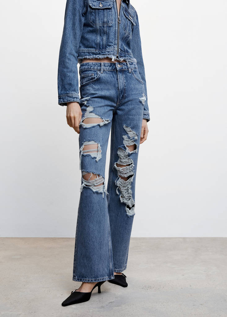 Tejido de algodón estilo tejano vaquero. Diseño recto. Diseño largo. Tiro alto. Rotos decorativos. Cierre de cremallera y botón. Cinco bolsillos. Trabillas. Largo interior 83 cm . Festival Season