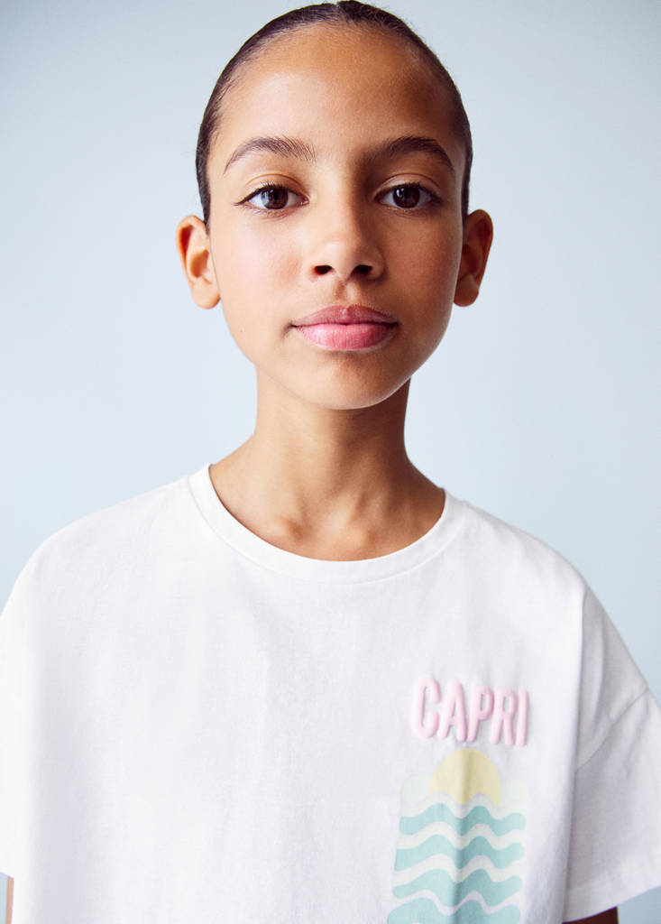 100% Cotton. Print. Round neck. Short sleeves. Crop design