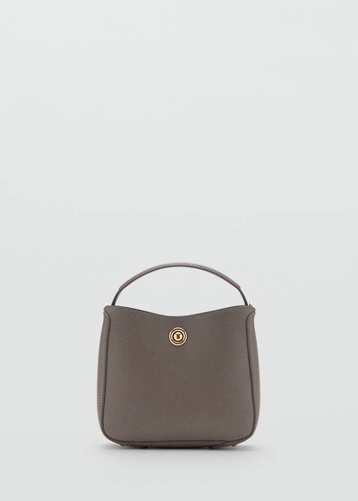 Small size. Bucket design. Short handle. Adjustable and detachable long strap. Inner zipped pocket. Metallic detail. One press stud fastening. Inner lining