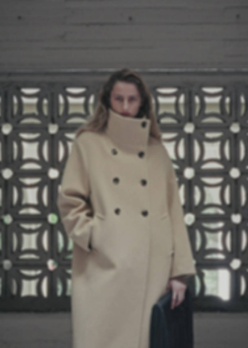 Wool mix fabric. Oversized design. Funnel neck. Cowl collar with button closure. Long sleeves. Two side pockets. Front closure with buttons. Inner lining