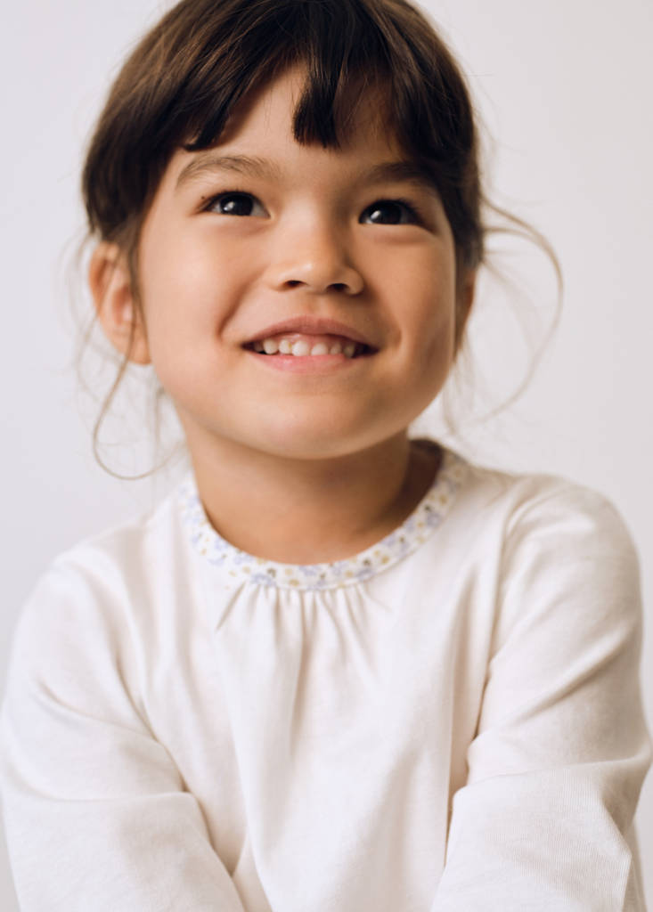 Straight design. 100% Cotton. Printed details. Round neck. Long puffed sleeves. Elastic trims. Button closure at the back. Back to class