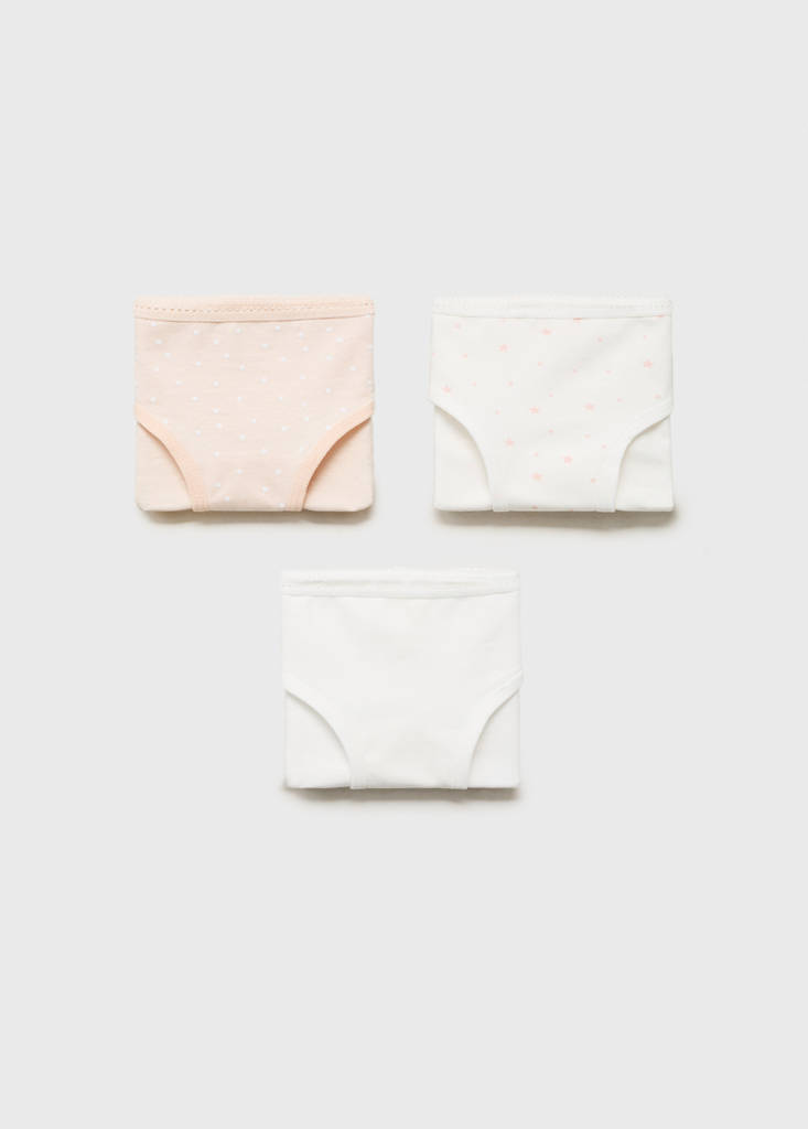 Pack of 3. Fabric with cotton. Classic design. Spots print. Star print. Elasticated waistband. Elastic finish. Cotton fabric. Classic panty