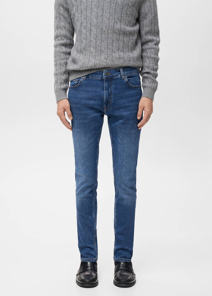 Cotton fabric. Medium wash. Belt loops. Zip and button fastening. Two side pockets. Coin pocket. Two patch pockets at the back. Denim jeans style. Skinny fit: the tightest fitting jeans