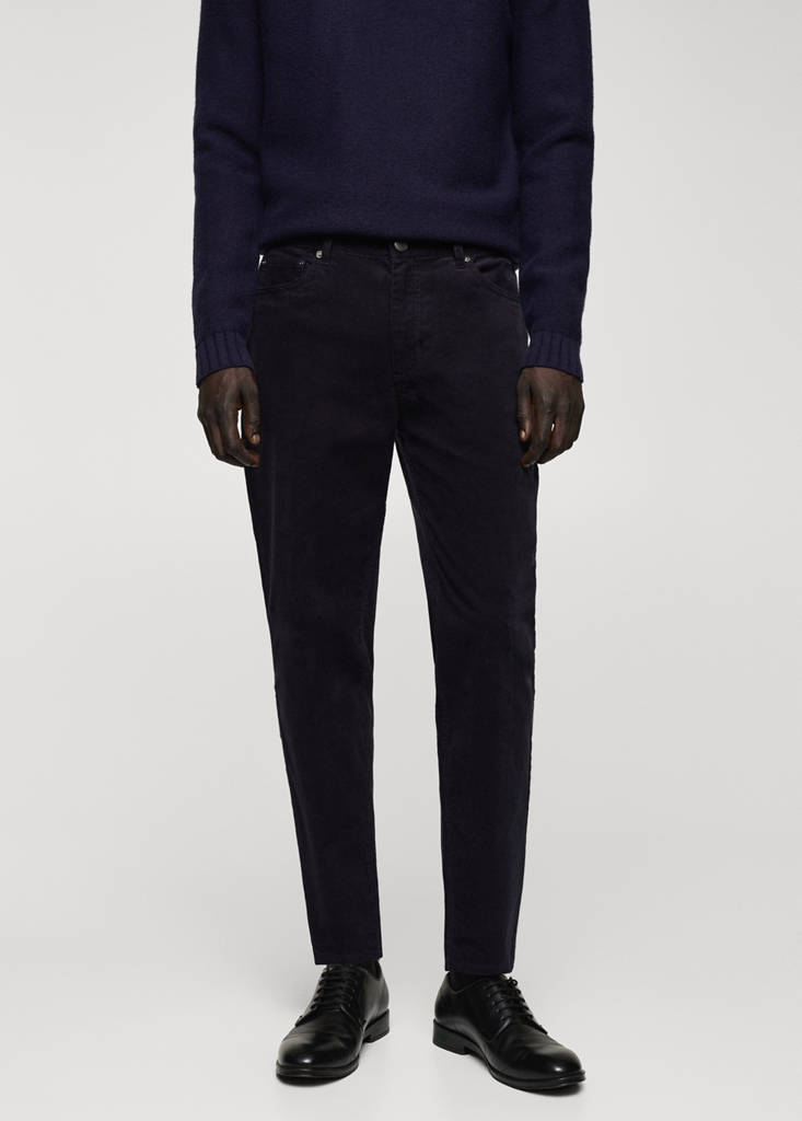 Micro-corduroy slim-fit trousersCurrent price [Php 4,295 ]Php 4,295Select a colourNavyThe model is wearing size 42 and is 188cm tall.Select your size38Not available. I want it!40Not available. I want it!42Not available. I want it!44Not available. I want it!46Not available. I want it!MeasurementsNotify meAdd to WishlistSee lookConvenient home deliveryCotton blend fabric. Micro corduroy. Slim fit. Zip and button fastening. Belt loops. Two front pockets. Coin pocket. Two patch pockets at the backDetails, composition and careStore availability