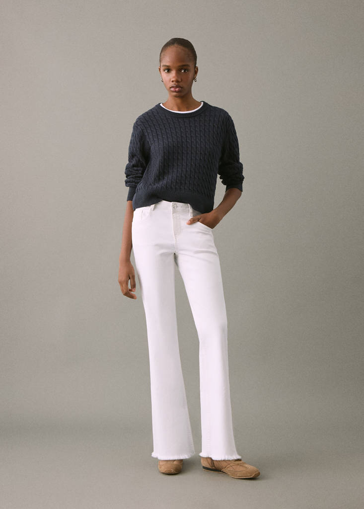 Cotton fabric. Stretch fabric. Long design. Flare design. Regular Waist. Belt loops. Button and zip fastening. Two side pockets. Two patch pockets at the back. Frayed trouser hems