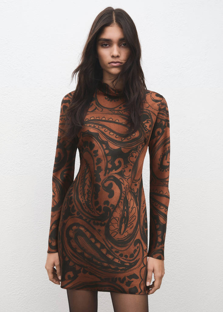 Fluid fabric with satin finish. Straight design. Short design. Paisley print. High neck. Long sleeves. Back zip fastening. Available Plus