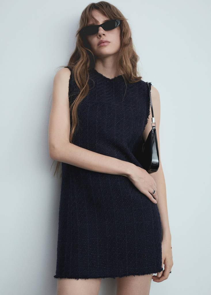 Tweed fabric. Straight design. Short design. Round neck. Wide straps. Sleeveless. Zip fastening on the back section. Inner lining. Frayed finish
