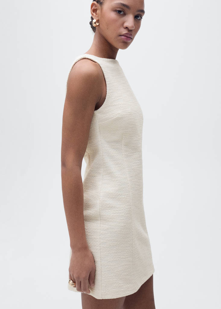 Tweed fabric. Cotton blend fabric. Short design. Fitted design. Boat neckline. Sleeveless. Invisible back zip fastening