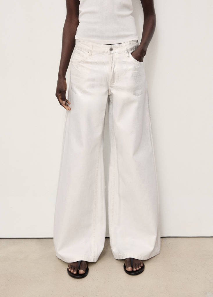 Long design. Wide-leg design. Metallic finish. Low waist. Belt loops. Five pockets. Front zipper and button closure