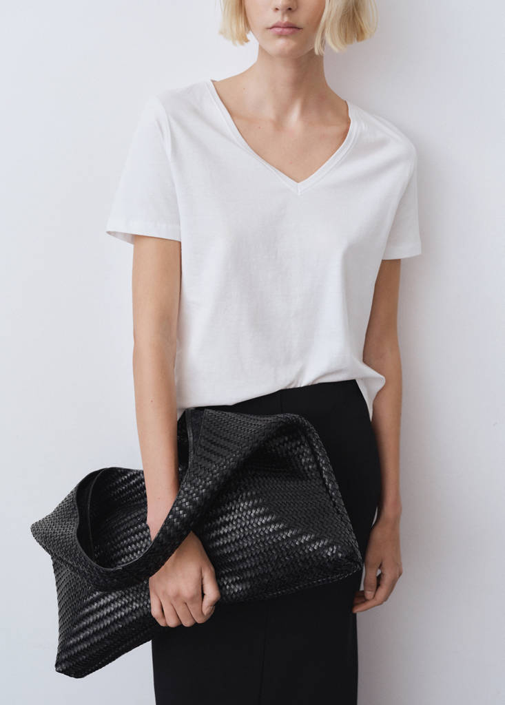 Cotton fabric. 80% organic cotton and 20% recycled cotton. Lightweight fabric (160g/m2). Light Weight. Regular fit. Straight design. V-neck. Short sleeves. No Fastening