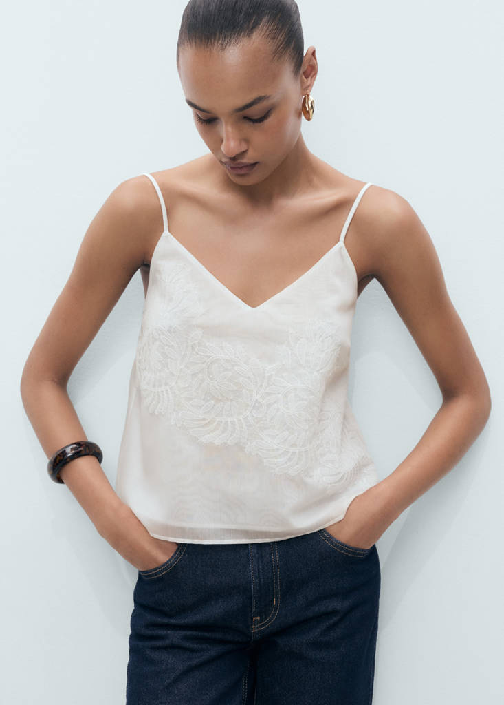 Straight design. V-neck. Sleeveless. Thin straps. Lace details on the front. Inner lining. No Fastening