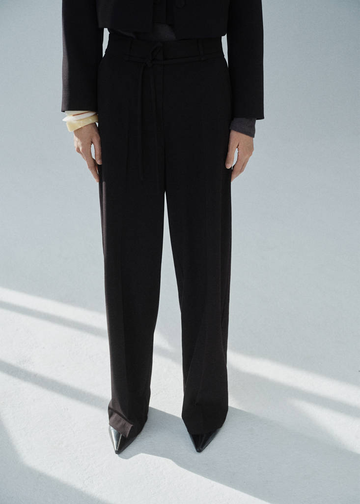 Straight design. Long design. Mid-rise. Belt loops. Two side pockets. Adjustable tie closure. Concealed button, hook and zip fastening. Inner lining. Total look