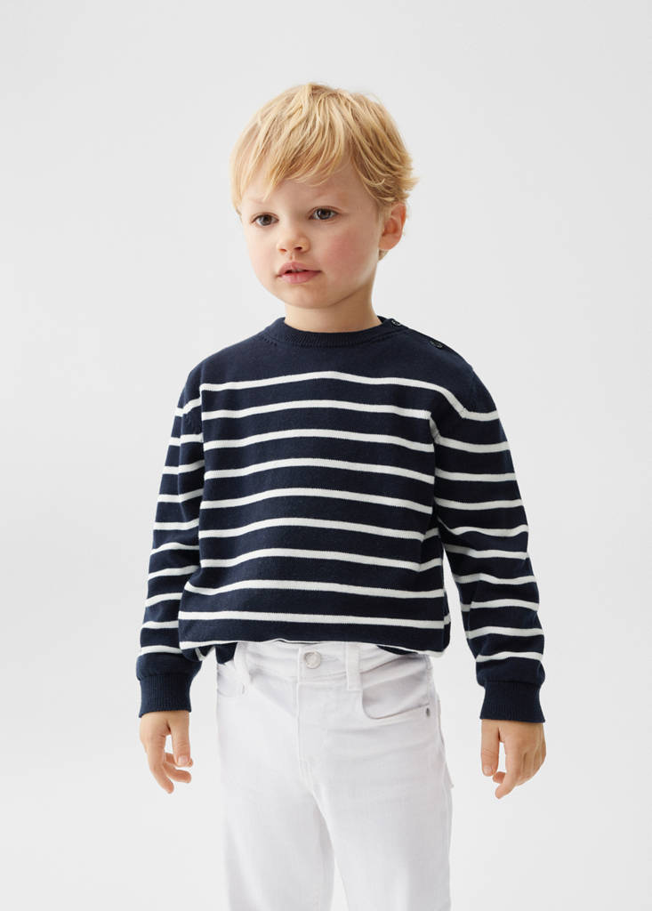 100% Cotton. Fine knit fabric. Straight design. Rounded neck. Long sleeve. Closure on the shoulder