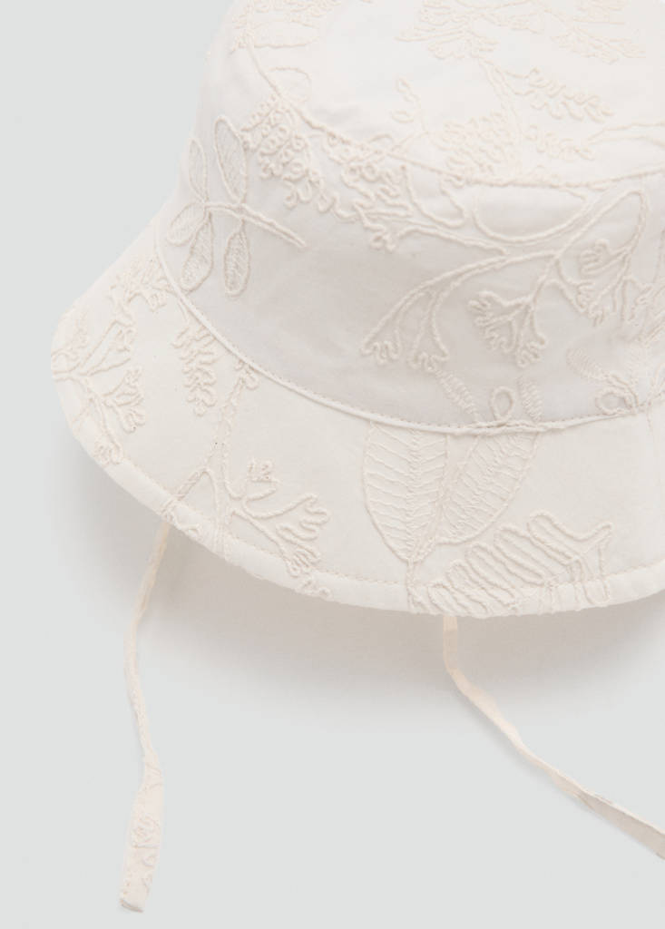 100% cotton fabric. Bucket design. Embroidered floral details. Tie fastening.
