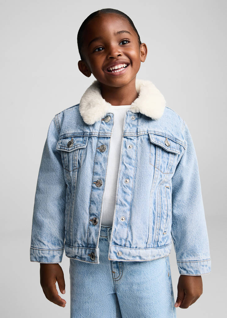 Denim-style cotton fabric. Straight design. Contrasted faux-fur collar. Long sleeves. Jeans with tie closure. Press-stud fastening