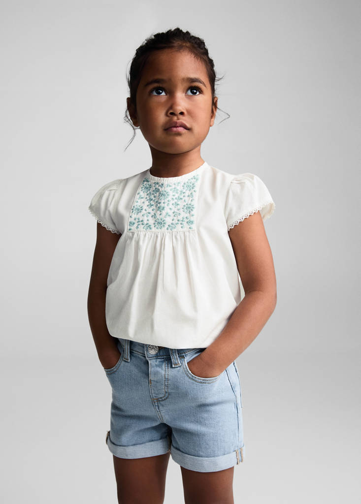 Denim-style cotton fabric. Straight design. Short design. Mid-rise. Five pockets. Elastic band. One press stud fastening