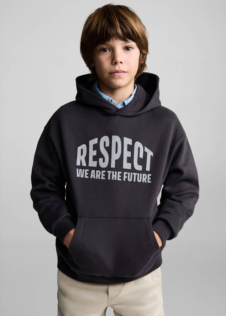 Straight design. Printed message. Hood. Long sleeves. Pouch pocket. No Fastening. Heavy weight