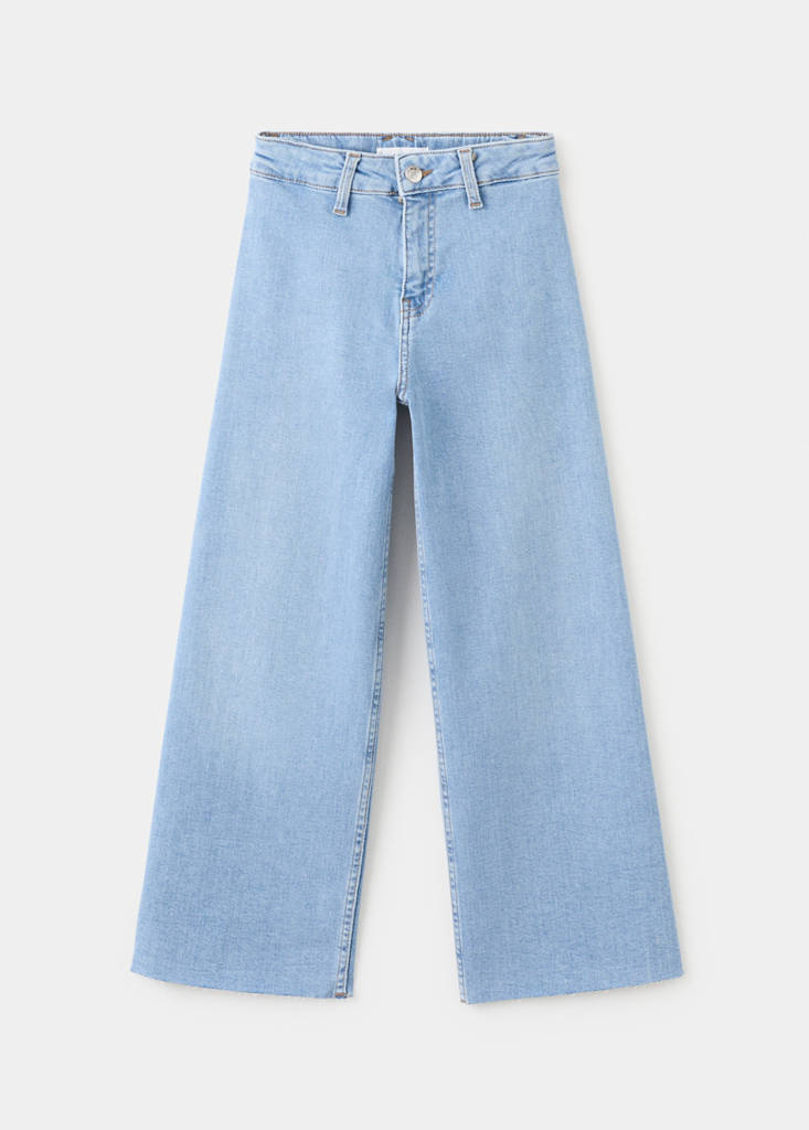 Long Long. High Waist. Medium Flat Structure. Culotte silhouette. Cotton fabric. Stretch fabric. Long design. Wide-leg design. Belt loops. Button closure. Adjustable Elastic Waistband. Two patch pockets at the back. Frayed trouser hems.