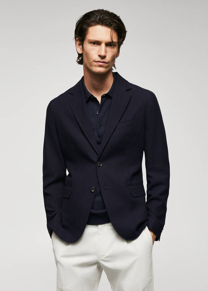 Slim fit. 100% Cotton. Cotton twill structure. Lightweight fabric. Notched lapel collar. Two patch pockets at the front. Long sleeves with buttoned cuffs. Straight hem. Double back slit. Interior pocket with button closure. Inner lining at the front. Front closure with buttons