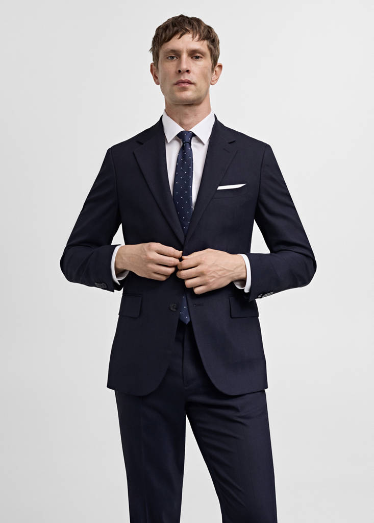 Bi-stretch fabric: its flexibility in all directions provides adaptability and comfort. Non-crease. Wool mix fabric. Slim fit. Herringbone structure. Lapel with notch. Chest welt pocket. Two pockets with flaps on the front. Double back slit. Two inner pockets. Inner lining. Tailoring collection. Thermoregulating: This fabric offers optimal breathability to keep you at a stable temperature. Front closure with buttons. Long buttoned sleeves