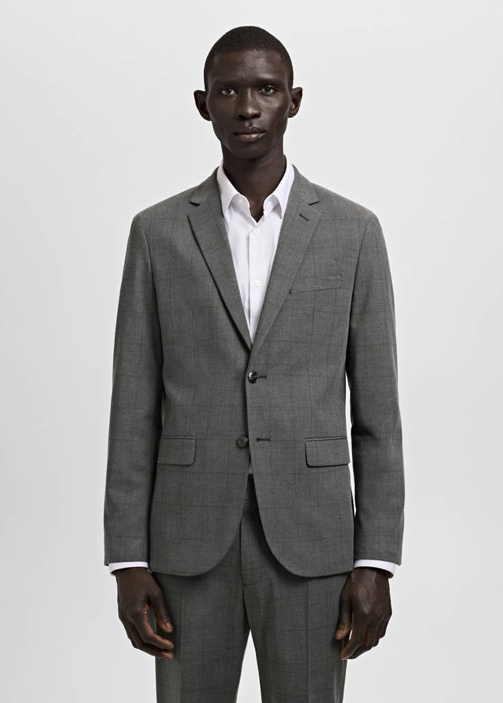 Super slim fit. Notch lapels and buttonhole. Chest welt pocket. Two pockets with flaps on the front. Interior pocket. Inner lining. Long sleeves with buttoned strip cuffs.
